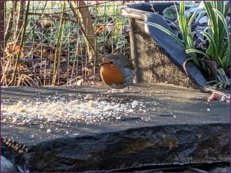Two winter visitors share the volunteer gardeners' biscuits at coffee break!